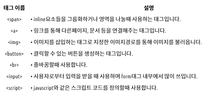 inline 요소들은 생성시 block태그와 달리 줄바꿈없이 이전 요소 바로 뒤에서 가로로 배치된다.