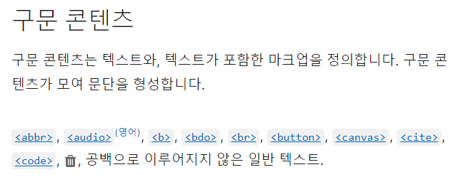 A: 공식문서(mdn)을 보면 알 수 있습니다. h mdn에서 살펴보면, 가능한 컨텐츠: 구문컨텐츠(텍스트 레벨의 요소...) 라고 나와있습니다.