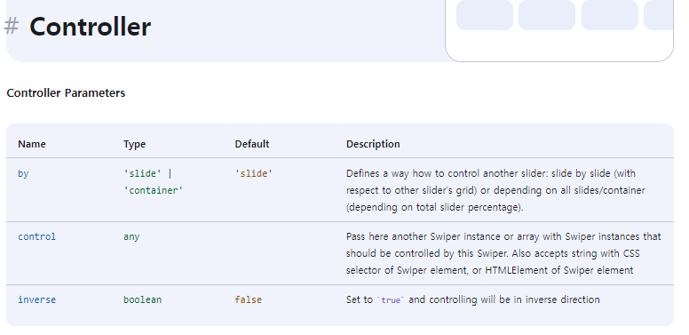 Swiper API에서 Controller의 Parameter로 'control'이 있는 것을 확인할 수 있고,