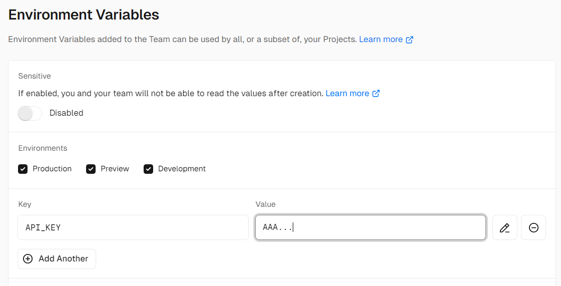 이 작업은 로컬에서 환경변수를 가져왔던 앞의 방법과는 다르게, vercel 서버에서 가지고 오도록하는 방법이다.