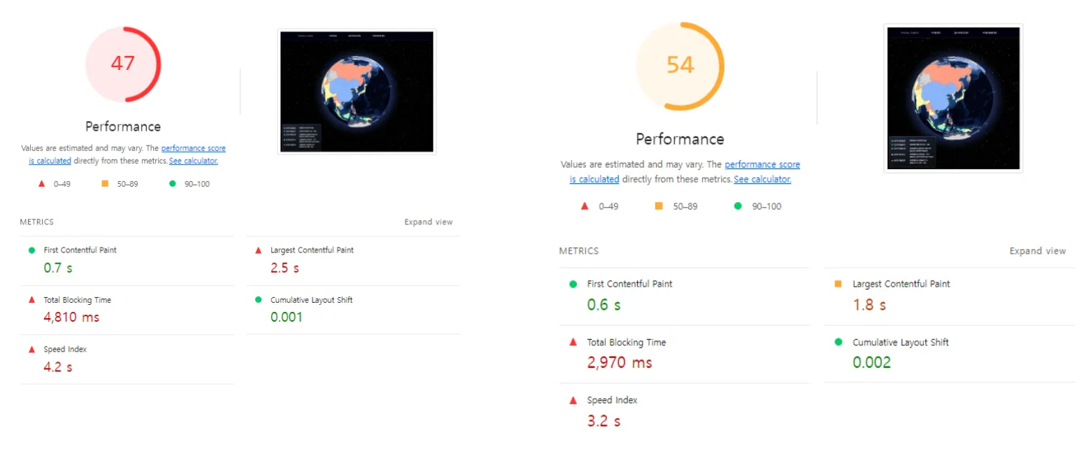 또한 key state를 사용한 조건부 리렌더링으로, 라우트가 변경되는 등의 필요한 경우에만 Globe 컴포넌트를 리렌더링하도록 최적화한게 작용한 것으로 추측된다.