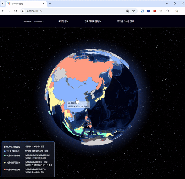 현재 개인프로젝트로, vite+typescript 프로젝트 환경에서 react-globe.gl 라이브러리를 이용하여지구본으로 국가별 여행위험경보를 띄우고 있다. 문제상황https://github.com/vasturiano/react-globe.gl GitHub - vast