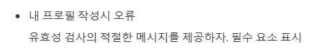 또한 유효성 검사에서도 적절한 메시지를 상황에 맞게 제공하면 좋겠다는 피드백을 받았습니다. 유효성 검사가 모든 페이지에서 통일성 있이 적용되었으면 좋았을텐데, 페이지를 팀원별로 담당하면서 개발하다보니 유효성 검사에 대해 서로가 관리하고 적용하는 방식이 달랐던 것 같습니다.